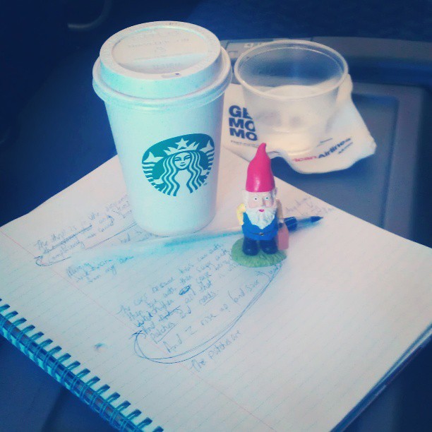 It’s time for you to say hello to my little friend (below). His name is Fuckles. My traveling gnome buddy has been with me for about 15 years, and he has shared in every adventure. Here, he is flying the friendly skies with me as I compose a poem at 30,000 feet…