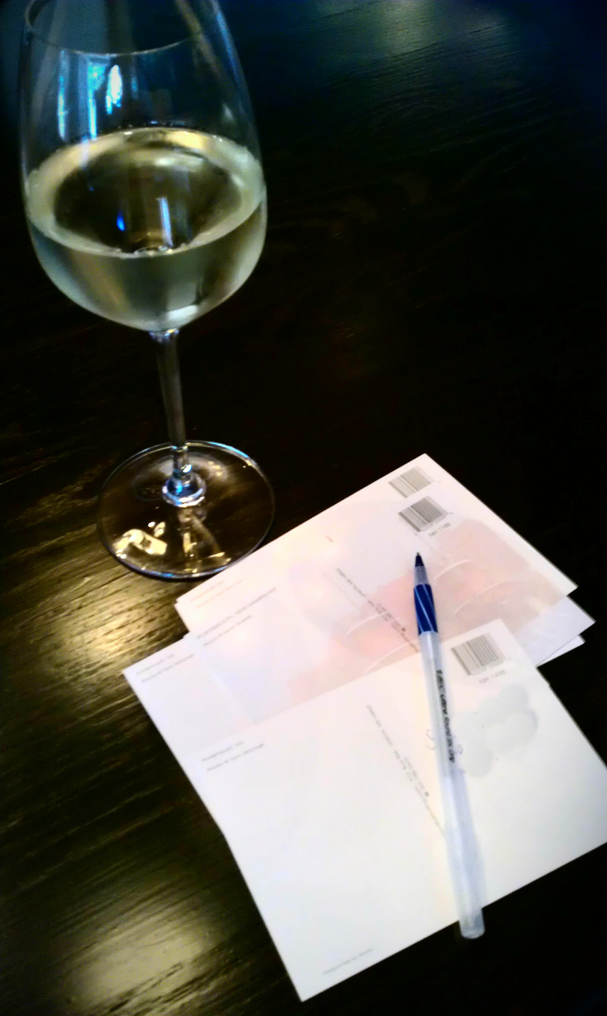 Above: writing postcards while enjoying a glass of white at a beautiful wine bar. Blocked out the address for safety purposes. Heh heh…