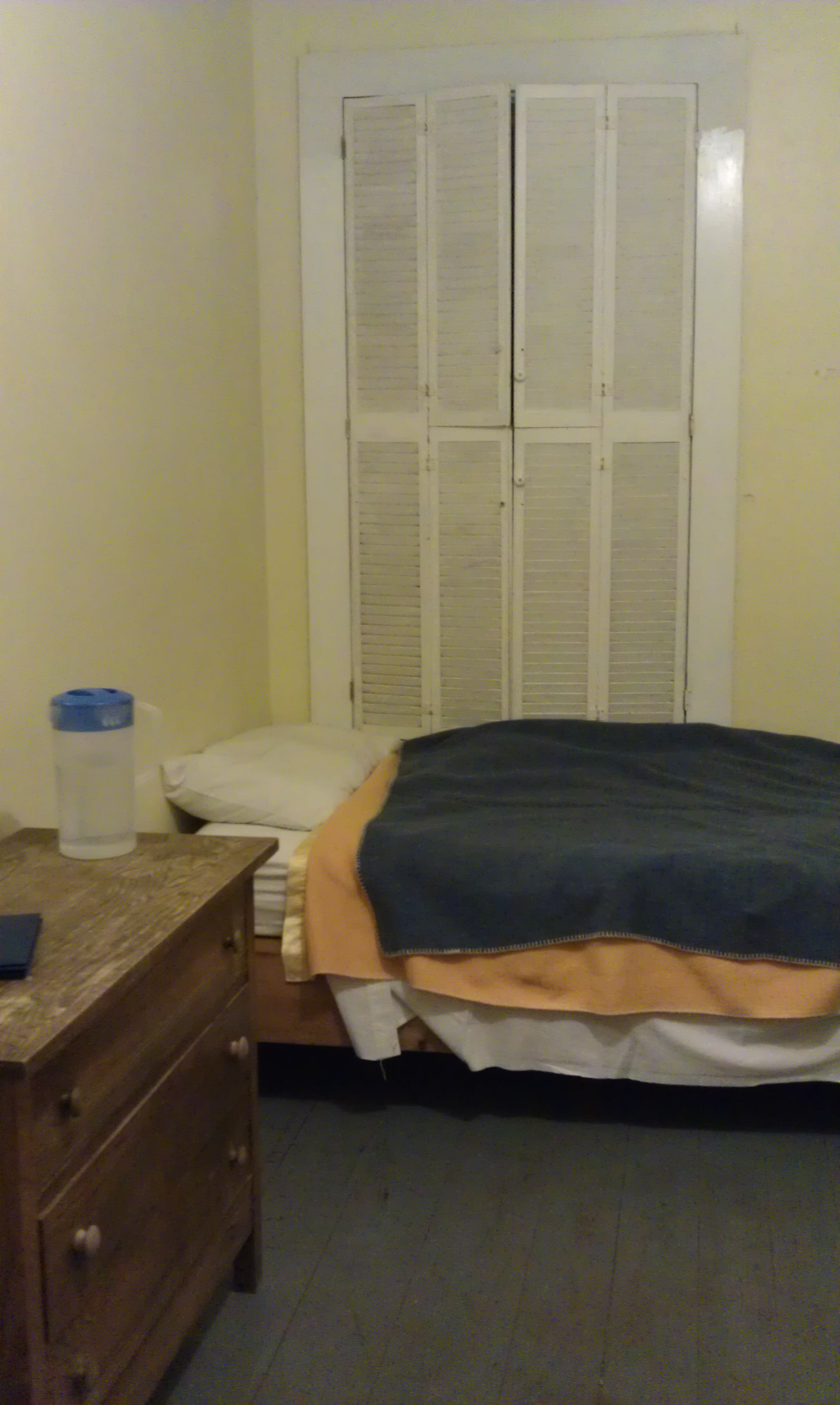 Above: nothing but hardwood floors, an old dresser, a pitcher of drinking water and a glass, a simple chair, a small bed (and another on the right that went unused – I had my own room…SCORE!), a few simple blankets, and one desk for writing/working on the other side…