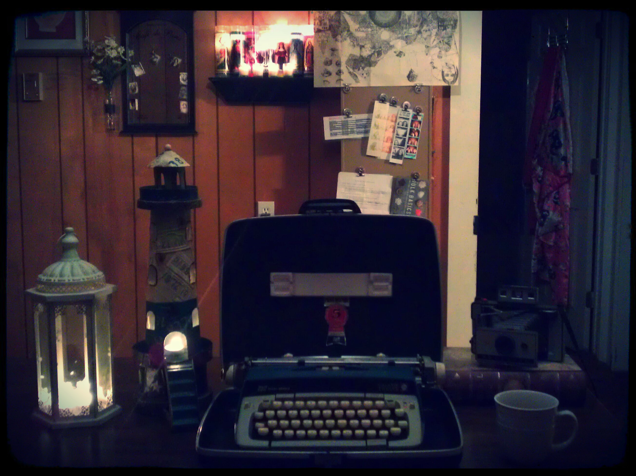 Behold, my beautiful vintage manual typewriter — a light blue Smith Corona Galaxie Twelve model 🙂