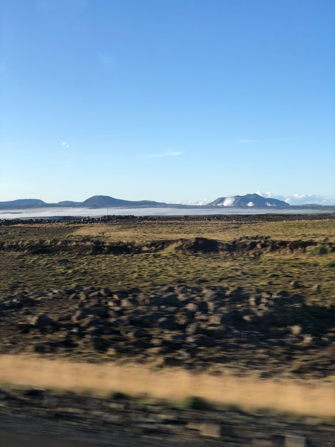 Above: even in this blurry shot taken on my way to Reykjavík via shuttle, you can already see glimpses of steam rising from hot springs in the ground, lava fields, and some of the smaller hills and mountains formed by volcanic activity.