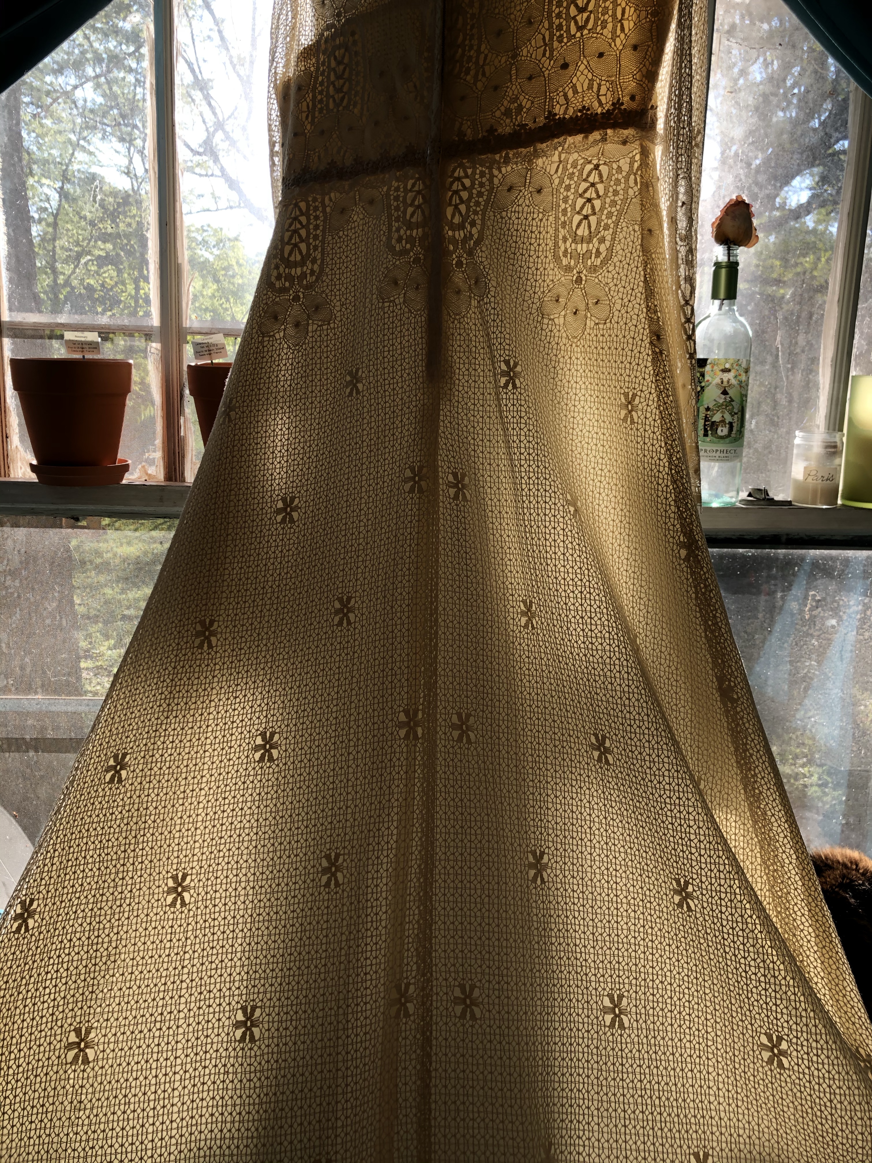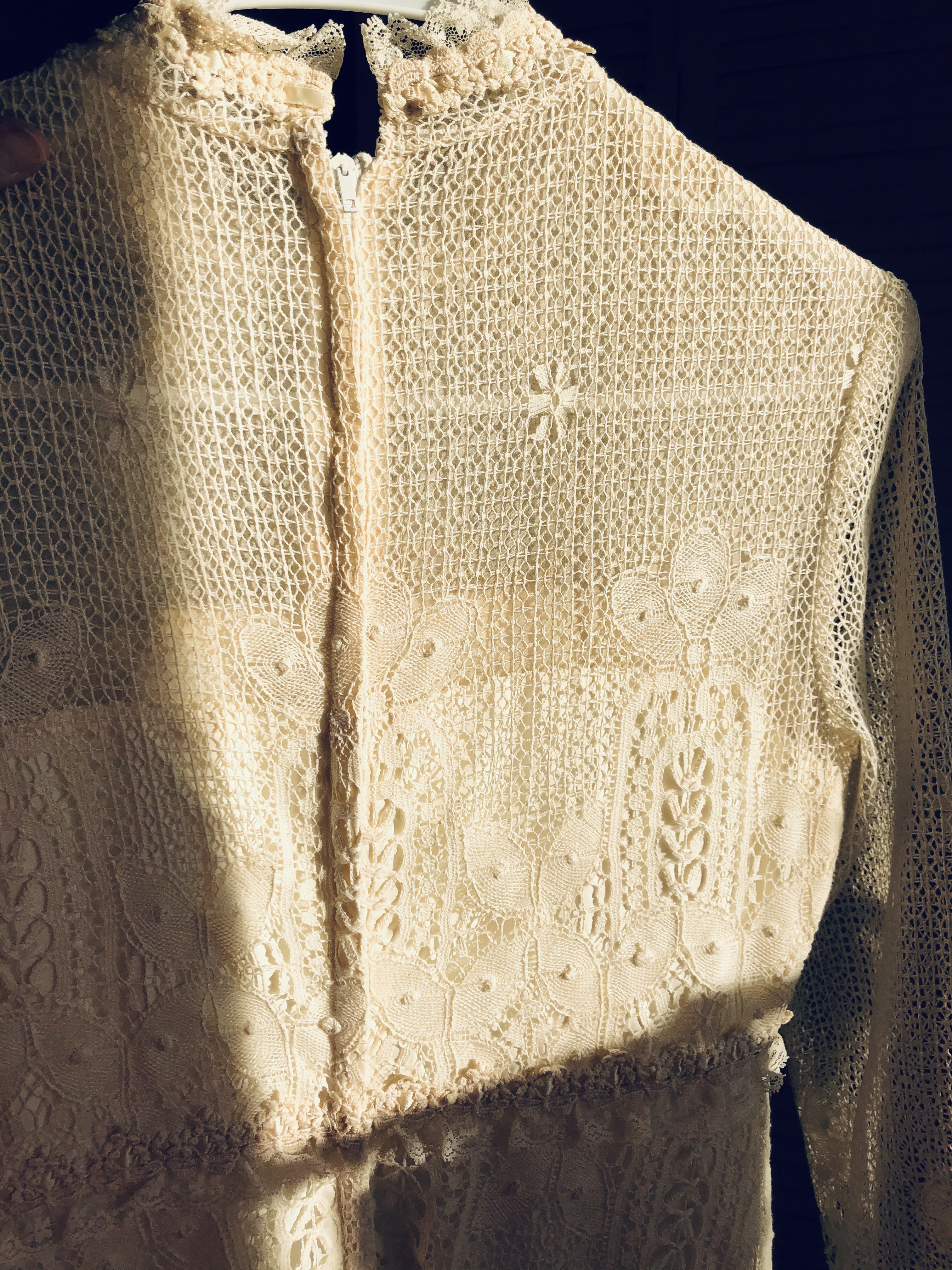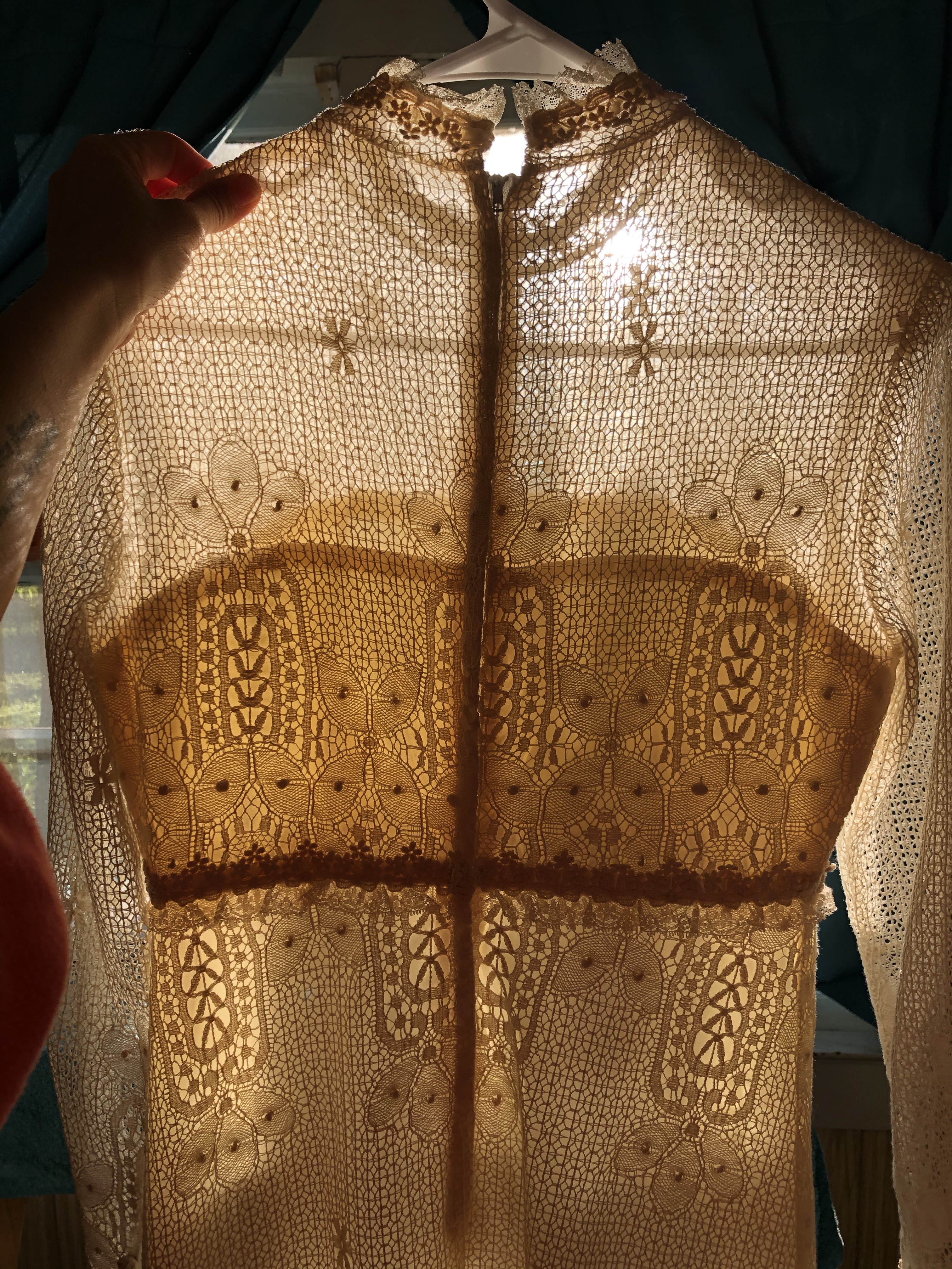 Okay, so there are many theories as to exactly HOW old this dress is. I’ve had several people inspect it, and it’s hard to pinpoint an exact time period. 1970’s at the VERY latest, but several have confirmed that it’s likely much older than that, just by looking at the intricate lace patterns and how they were crafted. If anyone out there is a clothing expert and can tell me when this dress was made, please send me a message! Here are some close up shots…