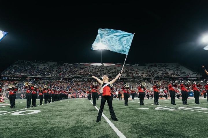 Lana has defeated Covid! 🎉 And there she is ⬆️, confident and shining on the football field as the head color guard captain of the her college marching band. #RedWolves #HowlYes 🐺