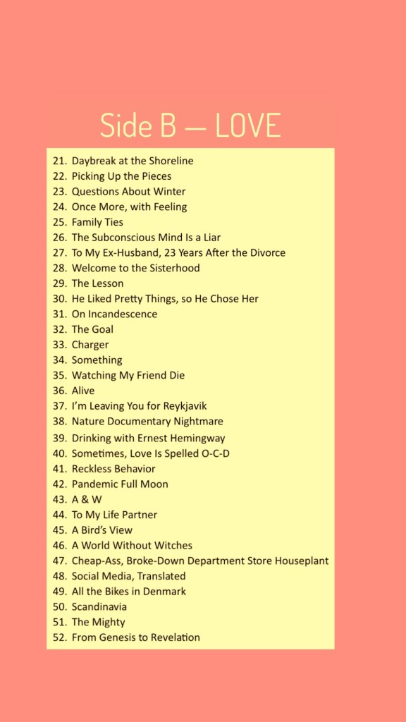My book is a lot like a music album — it’s divided into two parts (sides):